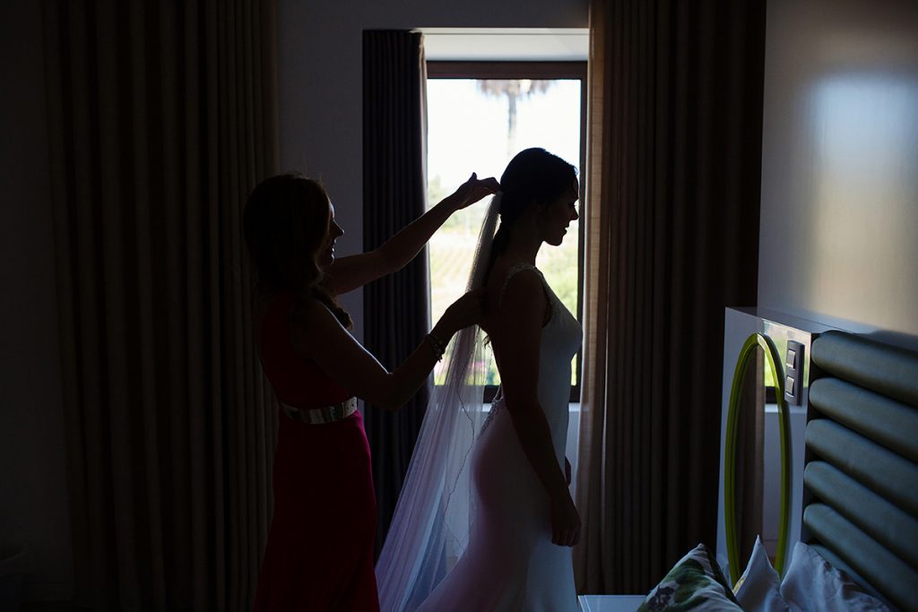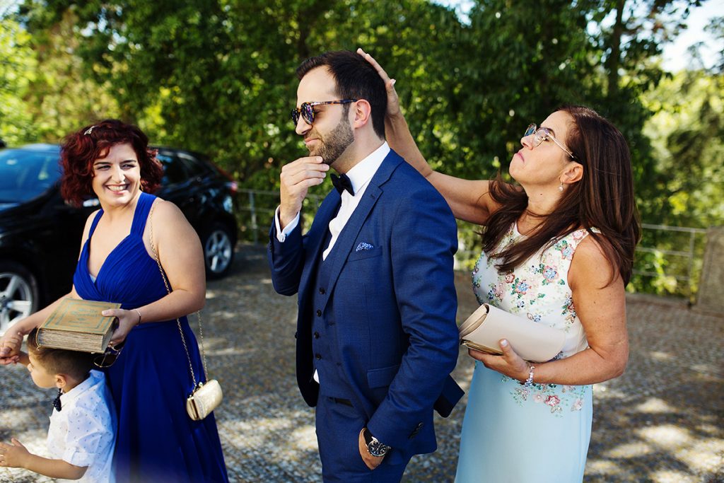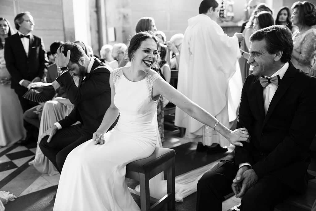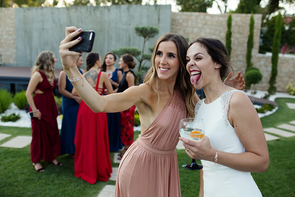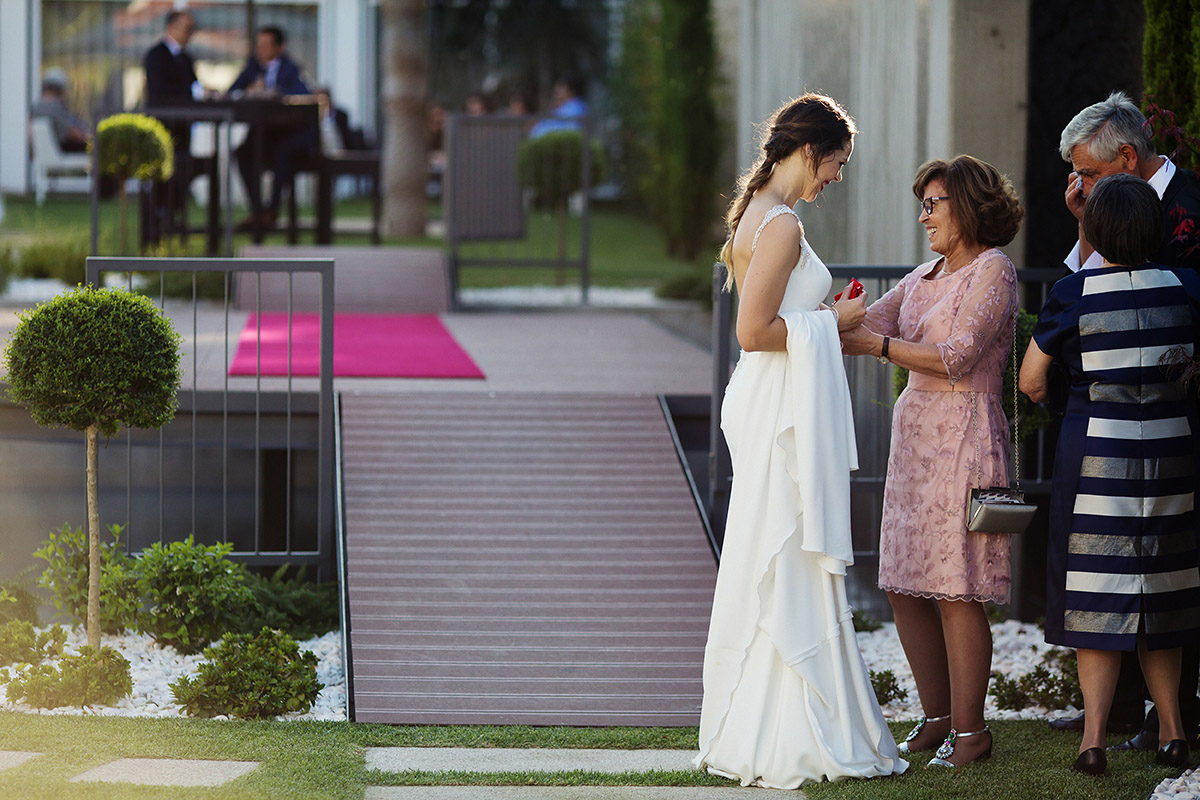 A atenção e o cuidado da Ana no reflexo do espelho não deixam de refletir o empenho para que tudo saia perfeito. O seu sorriso transmite a alegria que este dia lhe estava a proporcionar. Resultado: noiva feliz e satisfeita, um casamento que só poderia correr pelo melhor. Ficou deslumbrante com o vestido e os sapatos da Pronovias. O vestido de noiva é um dos elementos mais importantes num casamento, ainda para mais porque a noiva será todo o centro das atenções, não só porque o dia é dela e do seu companheiro mas também por toda a sua indumentária ser tão diferente daquela que está habituada a usar nos demais dias.
